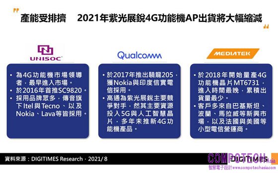預期紫光展銳於中系智慧型手機AP市佔率從2021年上半的6%,明顯提升至2021年下半的10%,主因高通與聯發科受限於4G AP供給短缺且交期長,又逢4G AP採購旺季,紫光展銳成缺貨潮下的最佳替代選擇。