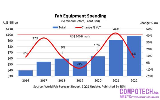 2021年9月15日--SEMI(國際半導體產業協會)於今(15)日公布的最新一季全球晶圓廠預測報告(World Fab Forecast)中指出,在數位轉型與其他新興科技趨勢驅動下,2022年全球前端晶圓廠(front end fabs)半導體設備投資總額將來到近1000億美元新高,以滿足對於電子產品不斷提升的需求,也刷新2021年才創下的900億美元歷史紀錄。
