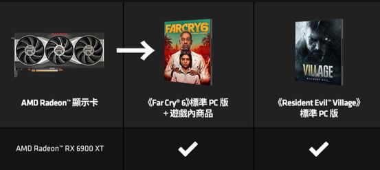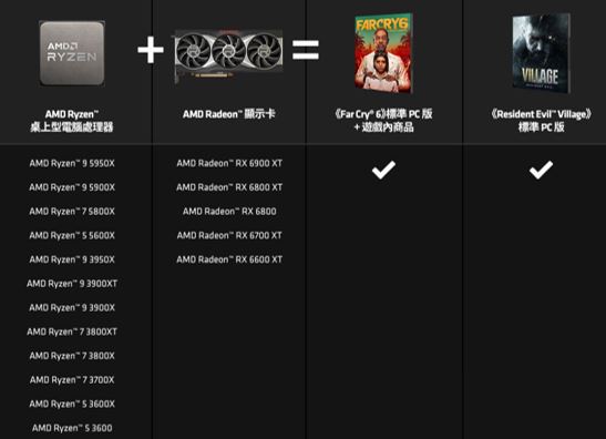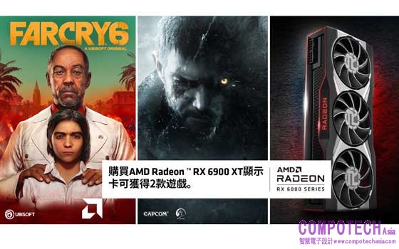 AMD宣布繼上週推出的最新AMD Ryzen™ + AMD Radeon™ Raise the Game遊戲大禮包,更進一步擴大回饋優惠,加入超高效能的Radeon RX 6900 XT顯示卡。即日起,凡購買AMD Radeon RX 6900 XT顯示卡,包括AMD夥伴廠商推出的超頻與水冷式版本,即可獲得《極地戰嚎6》與《惡靈古堡8:村莊》。除此之外,凡購買搭載指定AMD Ryzen 5000或3000系列處理器以及指定AMD Radeon RX 6000系列顯示卡的系統,也同樣可獲得以上兩款今年最受矚目的遊戲。