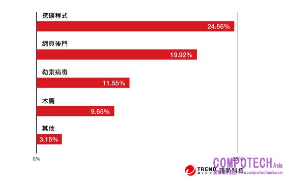 挖礦程式 (25%) – 虛擬加密貨幣挖礦程式的普遍程度之高,不令人意外,因為雲端上幾乎取之不盡、用之不竭的運算效能,對這類惡意程式來說,是最完美的天堂。