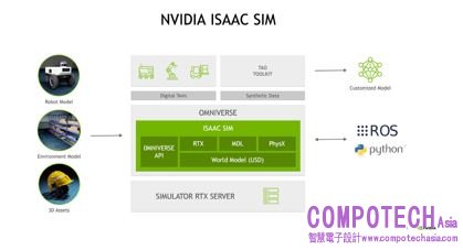 圖二_Omniverse 上的 Isaac Sim 功能區塊圖顯示機器人模型、環境模型及 3D 資產輸入項目