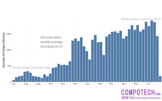 根據FortiGuard Labs的偵測顯示,殭屍網路的活躍程度大增,今年年初有超過三成(35%)的企業偵測到殭屍網路的活動,六月後比例再上升至五成(51%)。殭屍網路活動的大規模成長與惡意軟體TrickBot 的活躍度呈正相關。TrickBot原先是一種銀行木馬程式,後來進化為複雜的多段式工具包,來支援其他惡意攻擊,其中又以Mirai 最為常見。 Mirai的總活動量高居不下,攻擊手法亦不斷更新,瞄準遠距工作及居家學習的生活型態轉變,針對其物聯網設備進行更多的攻擊。