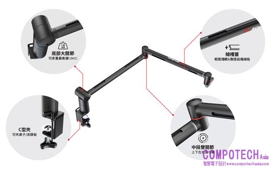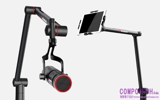 BA311支架本體的五個可動關節,提供最自由的調整角度,創作者能以更多方式規劃自己的創作空間,BA311支援市面上主流的麥克風、相機和平板電腦,可以將麥克風線材貼合於支架設計的內嵌理線槽,架設在桌緣也可以提高空間的使用效率,透過整齊的線路、高效率的空間運用增進創作者的生產力。