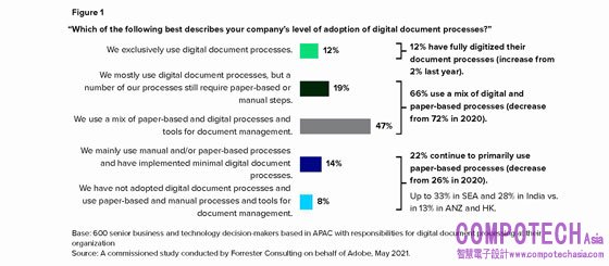 圖一:數位文檔流程於亞太區的採用率依然偏低,甚至呈下降趨勢。