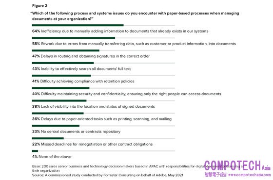 Adobe 先前委託 Forrester Consulting 進行研究,探討亞太區團隊如何利用數位文檔和電子簽名推動業務成果。報告有三點發現:第一,亞太區銷售團隊正將其文檔流程數位化,但對紙本的依賴程度仍然很高;其次,文檔流程數位化以及將傳統線下管道轉化為線上管道,有助提升客戶體驗;以及使用數位文檔流程的企業擁有更短的銷售週期及更理想的收益。
