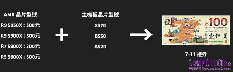AMD於台灣推出「買5000送500」優惠活動,即日起至2021年10月30日,凡購買指定AMD Ryzen 5000系列處理器以及X570、B550或A520主機板,即可獲得最高達500元7-11禮券,數量有限,送完為止,詳情請參閱活動官網。