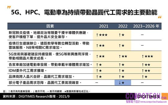 短期來看,即使2022年NB等產品出貨動能恐不若2021年亮眼,使得該年全球晶圓代工業景氣浮現雜音,然5G智慧型手機滲透率可望持續攀升,加上數位轉型推升雲端運算需求,並帶動HPC晶片出貨成長。