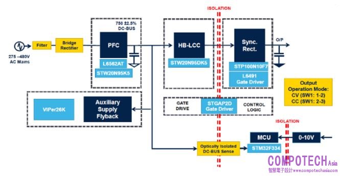 STEVAL-LLL009V1數位300W電源方案由功率因數校正(PFC)和半橋LCC諧振轉換器功率級組成。在此方案中,STM32F334R8微控制器實現了直流轉直流和輸出同步整流數位控制,而PFC則由L6562AT控制器在過渡模式下驅動。該系統支持恒定電壓(CV)和恒定電流(CC)操作。為了提高效率,本方案將MDmesh K5和MDmesh DK5電源MOSFET分別用於PFC和 LCC半橋,同時採用STripFET F7電源MOSFET來減少二次側同步整流階段的傳導損失。