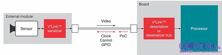 V3Link TSER953 序列器及 TDES954 和 TDES960 解除序列器等特殊串開轉換 (SerDes) 技術,是以串聯方式運作,透過一條超細線路同時傳輸高解析度影片、控制訊號及電源。這類裝置協助在感測器及處理器之間建立鏈路,彙集時脈 、未壓縮影片、電源及一般用途的輸入/輸出訊號,如圖 2 所示。