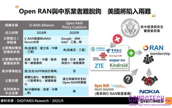 DIGITIMES Research分析師吳伯軒認為,Open RAN相關業者仍將受惠歐美對中企制裁,而加速於全球商用市場規模化發展,然要藉由Open RAN達到脫鉤、排除中企電信設備的目標恐難達成。