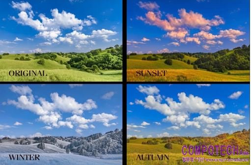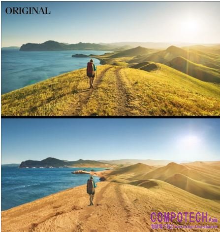1. 景觀混合變換濾鏡(Landscape Mixer):景觀混合變換濾鏡可任意結合兩幅風景影像,瞬間創造全新風景、概念藝術或天馬行空的場景。例如將陽光明媚的夏日圖像轉換為冬景,將樹上的綠葉轉換為秋葉;或將正午拍攝的照片轉變為日落黃金時刻的效果。場景中的人物或其他主體,也將被自動套上遮色片,融入新建的圖像。