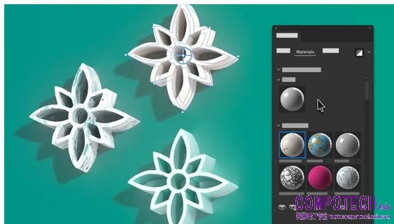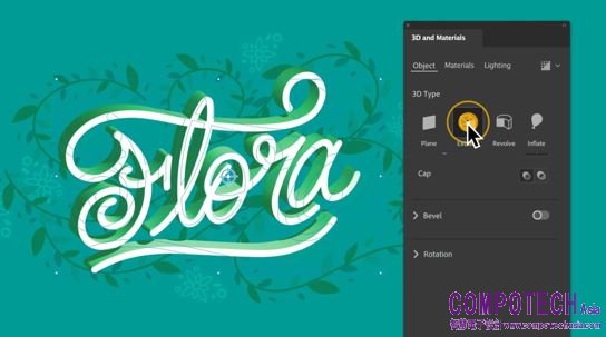 圖二: 更新後的 3D 面板可協助用戶輕鬆從路徑建立 3D 物件,並添加光源、旋轉及紋理設計。