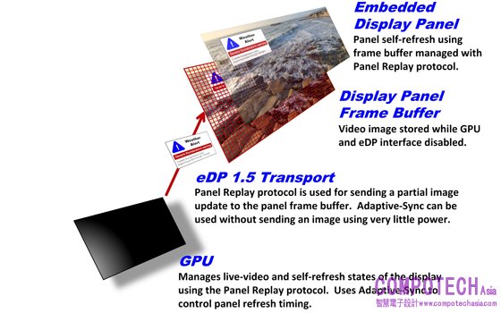 圖_嵌入式DisplayPort(eDP)1.5版本透過全新Panel Replay協定,強化面板自動刷新功能。在自動刷新的過程中,GPU和eDP 1.5介面進入低耗電狀態,將能節省用電並延長電池壽命。Panel Replay的使用強化了顯示器的時間控制並與Adaptive-Sync相容,藉以簡化面板控制協定,同時進一步節能省電。
