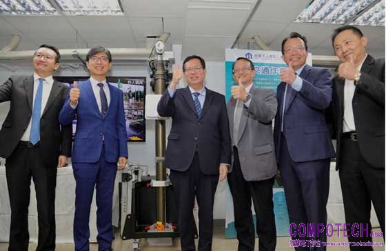 圖說:科技專案所研發的「AI智慧路口安全警示系統」,預期可降低15%以上事故率,圖左起為:力歐新能源連恆主席、經濟部技術處邱求慧處長、桃園市鄭文燦市長、交通部科技顧問室王參事暨科顧室主任、資策會系統所蒙以亨代所長以及力歐新能源陳宥誠董事長與路側設備合影。