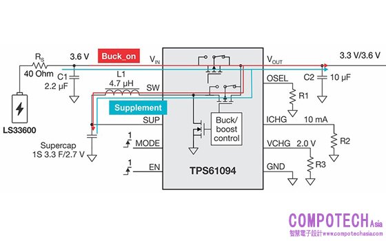 在溫度範圍內,來自超級電容器的可用能源不變。一般使用多層電容器 (HLC) 或雙電層電容器 (EDLC) 做為功率緩衝器,可提高脈衝負載能力。然而,儲存在這些被動元件中的能源需視電池電壓而定。溫度降低時,電池電壓也會下降,進而使 HLC 或 EDLC 的脈衝負載能力劣化,並造成電池的供應電流增加。而 TPS61094 可維持超級電容器的電壓穩定,且不受溫度影響,因此能排除前述問題。