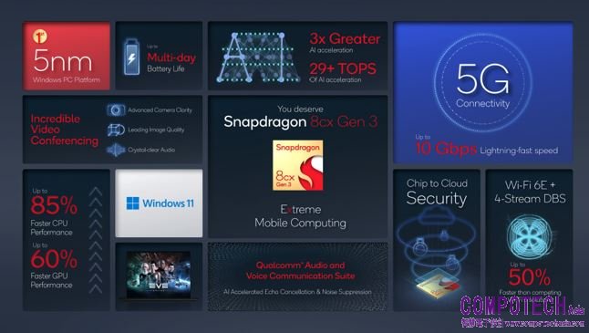 • Snapdragon 8cx Gen 3是全球首款5奈米PC平台,提供最頂級的效能和效率。先進的5奈米製程節點結合其他最佳化功能,能夠顯著提升高通Kryo™ CPU的效能,同時保持與上一代產品相似的功耗,將效率提升至驚人的全新水準。透過整合全新的主要核心,Snapdragon 8cx Gen 3與前一代相比效能普遍提升高達85%,與競爭的x86平台相比,每瓦效能提升達60%*。這表示使用者將體驗到頂級的運算能力,在生產力應用程式中工作更快速,且擁有長達多天的電池續航力。在網頁瀏覽、影片和照片編輯、以及視訊會議等GPU高強度運作的活動中,使用者將受惠於高通Adreno™ GPU的繪圖和軟體體驗,效能與前一代相比顯著提升60%。此頂級平台還支援Full HD(高達每秒120楨)的遊戲,並已透過最佳化讓使用者暢玩遊戲的時間,比特定競爭平台多50%**。