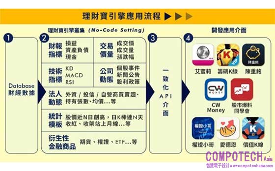 奠基在深厚的資料處理能力上,CMoney除了替全職操盤人設計投資工具產品,更積極打造一般投資人也好上手的App。各類投資模式或是專家知識,CMoney均能把盤後資料導進雲端運算後,再直接以API傳到前端,將運算後的數據邏輯轉化成各類工具型軟體上的參考指標,讓用戶省去大量抓資料、計算的時間。CMoney的軟體開發速度非常快,平均兩周可推出一支App,相較一般開發App的效率快了近10倍 [1],API化的運作模式,也使各種投資數據能更即時回應市場需求,甚至廣泛應用於不同領域。
