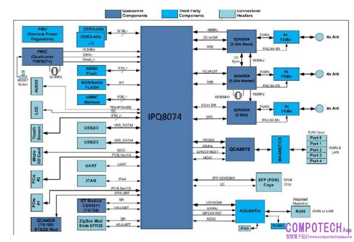本方案應用的IPQ8074是一款高度集成的SoC,旨在面向下一代企業接入點、運營商閘道和消費級路由器,提供最大化的容量、最廣泛的覆蓋及最優的性能。該產品集成了四個ARM Cortex-A53核心以及雙核的網絡加速器,支持2.4GHz上4X MU-MIMO和5GHz上8X MU-MIMO,這意味著其一次性能夠提供12流信道資料傳輸,傳輸數量可以輕鬆突破10Gbps,以確保為所有類型的應用程序提供最佳的Wi-Fi性能。