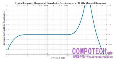 轉換器寬頻濾波器的抗混疊屬性會拒絕壓電感測器產生的頻外訊號。例如震動監測系統中常見的壓電加速度計感測器,其共振頻率可比一般訊號位準高出 +20 dB。這樣的共振頻率會在感測器響應要衰減前發生。如果共振受到激發,共振峰值 (以及其他發生在奈奎斯特以上的頻率) 將會混疊到帶通上,造成訊號頻率分析不正確。圖 4 說明典型高頻共振峰值的壓電加速度計頻率響應。