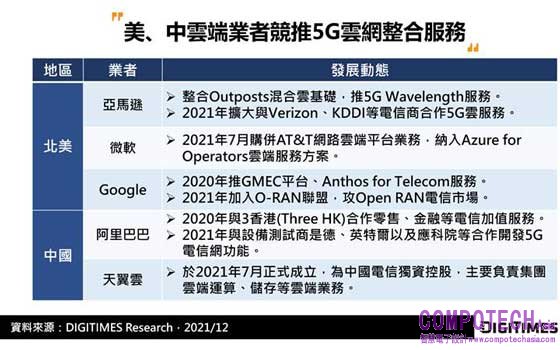 根據DIGITIMES Research分析師龔明德觀察,目前雲端業者投入5G雲網整合服務,以美系大型雲端資料中心較為積極,尤其微軟陸續購併行動電信網路、虛擬化技術業者,以及AT&T電信網路平台業務,藉此打造5G雲端電信網路方案Azure for Operators。而亞馬遜則主要以自行開發的Outposts混合雲方案基礎所推Wavelength服務,拓展5G電信基礎設施及邊緣雲運算市場。