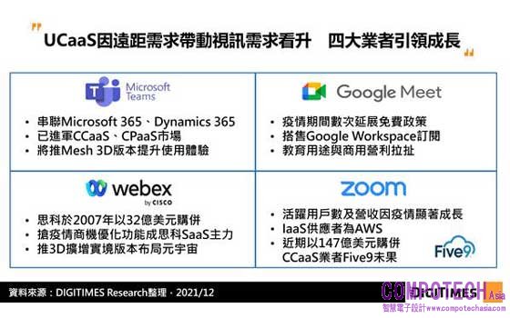在UCaaS領域中,近期以遠距視訊服務用戶數成長最顯著,其中,微軟(Microsoft) Teams、思科(Cisco) Webex、Google Meets及Zoom四視訊工具用戶數合計已逾全球75%。CCaaS方案有助企業提升客服效率及顧客體驗(Customer Experience;CX),全球三大公有雲平台包含AWS (Amazon Web Services)、微軟Azure與Google雲端平台(GCP)皆已利用各式AI即服務(AI as a Service;AIaaS)項目,來協助CCaaS方案供應商完善客服功能,並吸引更多企業用戶使用更多雲服務。