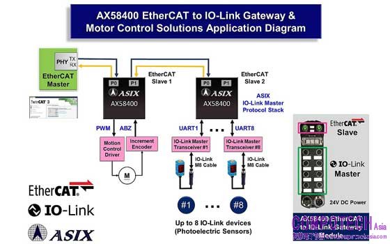 2022年1月11日--因應全球製造業對智慧生產自動化設備的強大需求,亞信電子(ASIX Electronics Corporation)多年來持續深耕工業乙太網路相關控制晶片的研發製造,並推出一系列高性價比的AX58x00 EtherCAT從站控制晶片與微控制器產品。為了進一步提供客戶更完整的智慧生產自動化解決方案,亞信積極投入開發最新的IO-Link主站通訊協議棧技術,並於今天推出最新可整合EtherCAT工業乙太網路現場總線技術與IO-Link智慧感測通訊技術的 - 「AX58400 EtherCAT轉IO-Link閘道器解決方案」。利用這個 EtherCAT從站轉IO-Link主站閘道器解決方案,客戶可以輕鬆地將最新的IO-Link智慧感測器與制動器等設備,導入智慧工廠的EtherCAT工業乙太網路環境中。