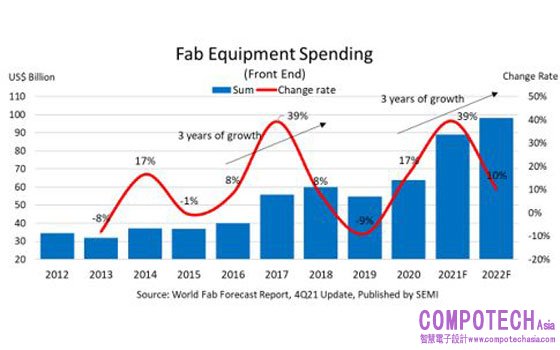 晶圓廠設備支出於2020年及2021年分別成長17%和39%後漲勢未歇,2022年將持續上揚。半導體業界上次出現連續三年晶圓廠設備投資增長為2016年到2018年,在那之前,則是將近20多年不見此至少連三年的漲勢,要回溯到1990年代中期。