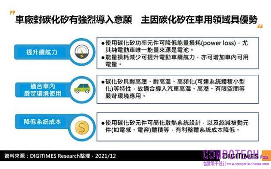 2022年1月13日--DIGITIMES Research 雖碳化矽(SiC)價格較矽半導體高出許多,然車廠仍有很高採用意願,主因碳化矽能量損耗低、具耐高壓、耐高溫、高頻化等特性,不僅適合於汽車嚴苛環境下使用,延伸好處是降低系統成本、提升功率密度等。DIGITIMES Research分析師林芬卉觀察,碳化矽在主驅逆變器及車載充電器(OBC)導入速度較快,且至2023年與矽基元件將會達到2.5倍甜蜜點的價差。