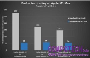 圖二:Apple M1 Pro 和 M1 Max 系統的新硬體加速功能可將 4K 和 8K ProRes 格式效能提升高達五倍。