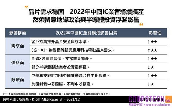 2022年1月25日--DIGITIMES Research 由於2022年晶片短缺未緩解,且供給面亦有疫情等不確定性因素干擾,中國大陸對晶片的需求仍將持續增加;另一方面,中國大陸晶片自製比例卻仍低,建產能將有助累積晶片自主化能力,因此,中國大陸IC製造業者將持續擴增產能。在IC設計業方面,中國大陸業者自建產能雖仍是零星個案,然中美科技戰持續延燒,中國大陸IC設計業自建產能趨勢仍值得關注。