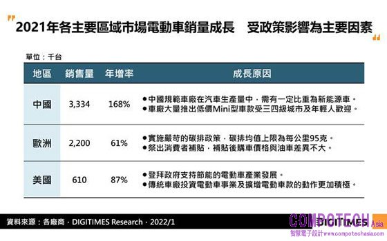 2021年中國電動車市場佔全球比重重回52%,返回第一大市場地位,主因中國規範車廠在汽車產量中需有一定比重為新能源車,以及車廠推出受消費者歡迎的低價小型車,使中國市場銷售量年增率高達168%;第二大市場歐洲則延續2020年棒子與蘿蔔政策,使銷售量年增率約達60%。