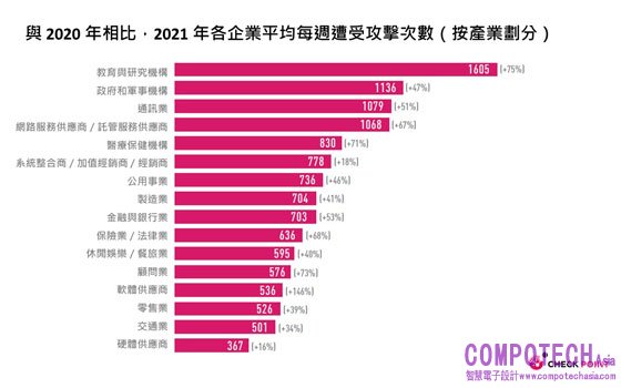 與 2020 年相比,2021 年各企業平均每週遭受攻擊次數(按產業劃分):