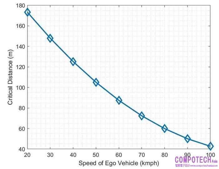 藉由瞭解後方來車的車距和車速以及本車的車速,可以計算變換車道開始時兩車之間的臨界車距 Scritical (第 5.6.4.7.1 節)。如果兩車之間的操作開始時的車距小於 Scritical,則不允許進行變換車道操作。下方圖 1 將 Scritical 繪製為本車車速的函數。請注意,對於 20kmph 的本車車速,臨界車距接近 180m。