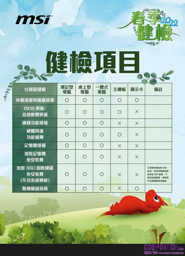 MSI致力於持續提供創新服務及最佳化使用者體驗,受到消費者及客戶一致的喜愛及讚賞。為回饋廣大用戶支持、提供更完善的售後服務,3/1-3/31春季健檢活動期間持MSI筆電、桌機、AIO一體成型電腦、主機板、顯示卡任一款至MSI直營/授權服務中心,不限保固內皆可參加。健檢項目包括外觀清潔與風扇清潔、BIOS 更新、硬碟及周邊功能檢測、記憶體掃描、散熱模組保養等,依不同類型產品提供專屬健檢服務項目。參加健檢並填寫問券即可獲得來店禮「MSI 質感霧黑工具袋、客製化口罩五色組」乙份,活動贈品數量有限,送完為止;另還能享有加碼抽獎資格,有機會將MSI 27吋電競螢幕Optix MAG274QRF-QD、電競週邊套組(包含電競鍵盤GK20、電競滑鼠GM11、電競耳機GH20、龍魂滑鼠墊GD30)帶回家!活動贈品數量有限,送完為止。