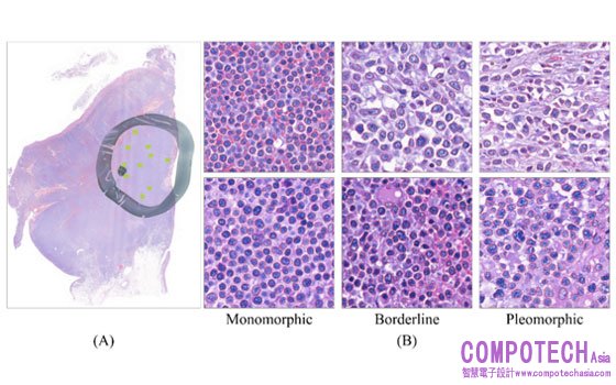 圖片說明:資料集所使用的影像樣本。(A)全玻片影像範例。資深血液病理醫師以黑色圈框人工標註高解析度視野,小綠點是隨機取樣的高倍率視野(High power fields,HPF);(B)自左至右代表淋巴瘤在高倍率視野下區分出的類型: MEITL、borderline(中)、以及ITCL-NOS(右),模型把偵測出的淋巴瘤,以紅線輪廓描繪呈現。