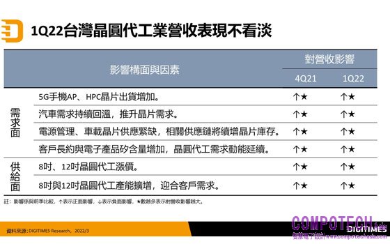 2021年台灣晶圓代工業約當8吋晶圓的平均銷售單價(ASP)漲幅達12.6%,加上產品組合改善,為營收成長帶來明顯效益。此外,業者因應強勁的代工需求,持續擴充產能,但全年各季產能利用率仍呈現逐季提升,帶動產出持續增加。