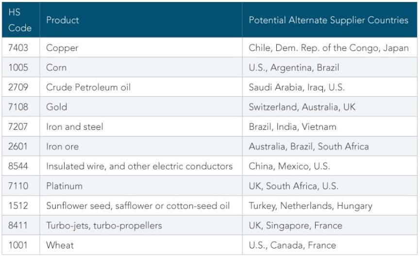 表1 烏克蘭和俄羅斯出口的主要產品的潛在替代供應商