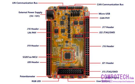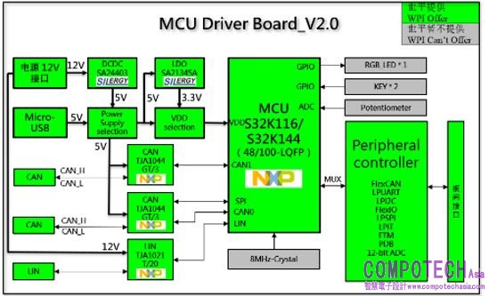 本方案面向通用汽車應用,提供豐富的測試組件,包括:板載CAN、LIN和UART/SCI 接口,並具有microUSB和12V電源兩種供電選項,可供用戶根據自己的需求靈活選擇。此外,方案採用的主控MCU——S32K1xx系列是NXP推出的一系列汽車級通用MCU,其基於ARM®Cortex®-M0+/M4F設計,提供了一個可擴展的平台,具有面向下一代應用的安全性、可擴展性、連接性和低功耗特性。憑藉著出色的特性,該系列不僅廣泛適用於需要在嚴苛環境下工作的電力電子應用,也同樣滿足需要利用引腳的低成本應用。