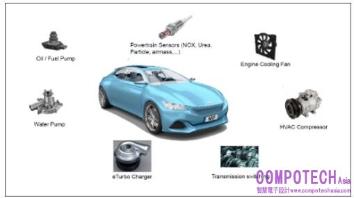 選用高效率、高耐壓、環境溫度範圍-40˚C至125˚C的車規級電源晶片;