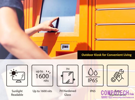 HMI人機介面應用觸角廣泛,常見於日常生活中的互動式資訊服務站(KIOSK),如自助購票機或得來速點餐機等。德承CRYSTAL系列的陽光下可視模組(Sunlight Readable Display Module)顯示亮度高達1600 nits以及Full HD(1920*1080)畫質解析度,即便在陽光下操作,螢幕畫面依然清晰。以高規格、工業等級設計,加上堅固鋁合金壓鑄前框、5萬小時的背光壽命以及7H高硬度投射式電容(Projective Capacitive),耐用又強固;通過IP65防水防塵測試,無懼日曬雨淋,專屬CDS技術除增添維護便利性外,也保留未來升級彈性,可運用在室外廢油回收櫃、快遞櫃、電動車充電樁、販賣機等戶外情境。