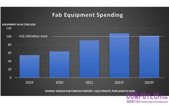 2022年3月22日--SEMI(國際半導體產業協會)於今(22)日公布的最新一季全球晶圓廠預測報告(World Fab Forecast)中指出,2022年全球前端晶圓廠設備支出總額將較前一年成長18%,來到1,070億美元的歷史新高,繼 2021年成長 42%之後,已連續三年大漲。