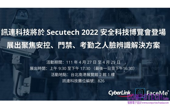 2022年4月13日--AI 人臉辨識領導廠商訊連科技(5203.TW)宣布將於 4 月 27 至 29 日,於南港展覽館二館舉辦之「Secutech 2022 台北國際安全科技應用博覽會」展出,聚焦智慧安控、智慧門禁考勤、智慧零售三大熱門人臉辨識應用。於本展中,除將展示 FaceMe® Security 智慧安控解決方案及FaceMe® SDK 跨平台人臉辨識引擎外,更搶新亮相全新的 FaceMe® Platform 人臉辨識 API 平台,及 FaceMe® Smart Retail 智慧零售、FaceMe® TimeClock 智慧差勤等全新解決方案。訊連科技於 Secutech 2022 之攤位編號為 826。