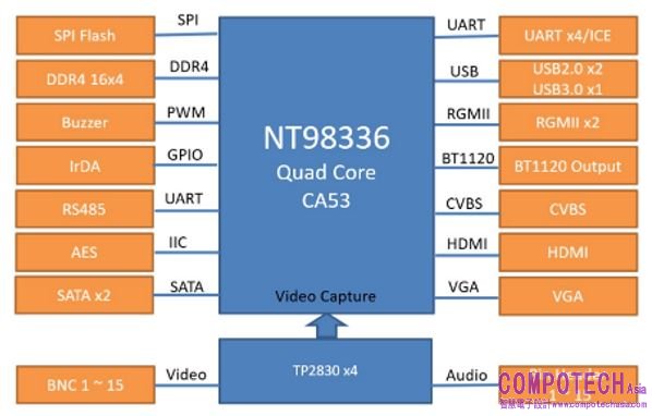 此外,NT98336也支持級聯式的串接(Cascaded Connection)延伸,可以將數顆NT98336的影像輸出整合成一個系統。例如單顆NT98336的處理能力為4K2K影像x4ch,利用Cascaded Connection可將4顆NT98336聯結成4K2K影像x16ch,或者是組成4M影像x32ch,如此彈性搭配可提升影像品質或port輸入數量。
