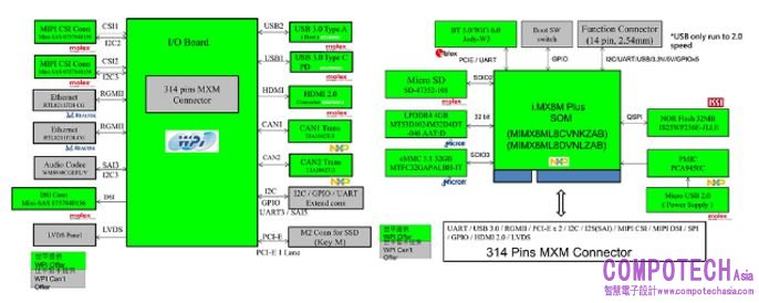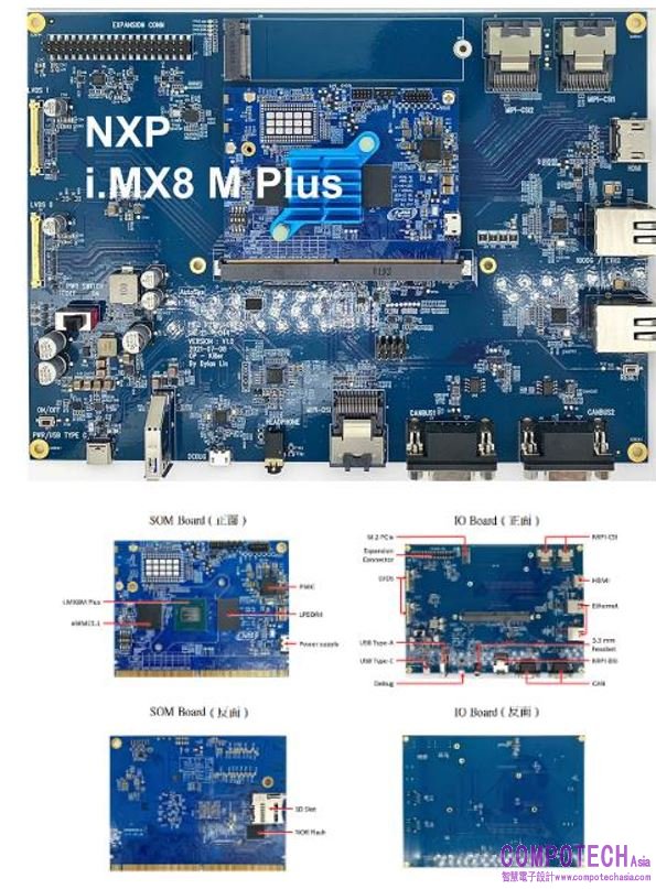 此方案由SOM Board和I/O Board兩塊開發板組成。其中,SOM Board為主要開發板,其採用NXP i.MX8M Plus平臺為基礎,提供1.6GHz或1.8GHz兩種規格的4x Cortex-A53處理器以及1200萬畫素的圖像處理器ISP、2.3TOPS算力的神經網絡處理器NPU、圖形加速器2D/3D GPU、音效數位訊號處理器HiFi 4 DSP等強大架構。其中,神經運算處理器NPU為此晶片的核心亮點,借助其獨特的硬體架構特性,能夠在低功耗的環境下提供極高的計算效能,從而大幅度提高機器學習的推理效益。