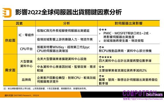 2022年5月6日--DIGITIMES Research 根據DIGITIMES Research分析師龔明德統計與分析,2022年第1季仍有低階IC(如PMIC)與MOSFET等元件供應長短腳問題,加上農曆過年因素,業者伺服器出貨速度較緩,雖有來自前季部分未完全滿足的訂單遞延,全球伺服器出貨量較1月預估減幅稍擴大至4.5%。預期第2季伺服器IC、零組件仍有缺口,且中國封城措施將影響部分供應鏈出貨進度,所幸北美大型資料中心需求強勁支撐,預估全球伺服器出貨量將季增近9%。