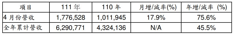 創意電子股份有限公司(股票代碼:3443) 今(5)日公佈2022 年 4 月份營業額為新台幣 17 億 7 仟 7 佰萬元。與上個月份營業額比較,增加 17.9%。與 110 年同期營業額比較,增加 75.6%。2022 年全年累計營收為新台幣 62 億 9 仟 1 佰萬元,較去年同期增加 45.5%。