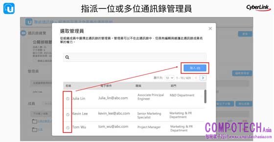 此外,管理者可勾選「啟用聯絡通訊錄」,成員將看到自己所屬的所有通訊錄,於啟用「自動接受來自同一組織成員的聯絡人邀請」功能後,無需待對方回應,即可一鍵完成聯絡人新增,開始傳訊或撥打電話,針對專案執行的過程進行即時的討論與調整。如對方為組織外之成員或非現有U使用者,仍可將對方加入通訊錄並寄送U通訊使用邀請。