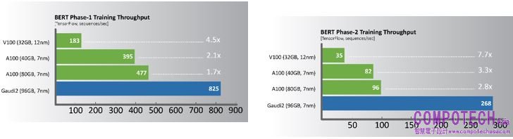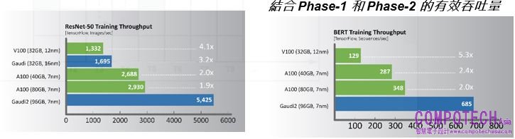 活動當下,Habana展示Gaudi2於電腦視覺—ResNet-50(v1.1)和自然語言處理—BERT Phase-1和Phase-2的訓練吞吐量效能,其工作負載量幾乎是Nvidia A100 80GB處理器的2倍。