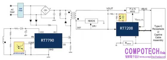 RT7790特別針對如RT7208E等控制器設計以形成支持USB PD協定或可程式控制電源適配器的完整電源配置。