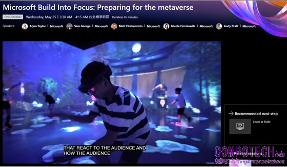 在本次大會中,微軟除了展示各項技術外,也分享對於元宇宙的看法,包含企業如何從元宇宙體驗中受益,以及如何運用目前的技術進入元宇宙。除了展示元宇宙應用於工業上的情境外,大會更於Into Focus: Preparing for the metaverse單元呈現由台灣夢想動畫於高雄所打造的夢境現實Moondream Reality混合實境沉浸式劇院,其運用微軟HoloLens 2混合實境裝置,搭配Azure Spatial Anchors解決方案,將互動創意和混合實境技術完美融合,帶來多維度、多層次的新型態互動式娛樂體驗,為文化娛樂產業開創新的商業模式。這也是微軟台灣夥伴繼2021年天晟醫院HoloLens運用實例後,再次登上Microsoft Build開發者大會,為全球呈現台灣傲人的先進技術與創新能量。